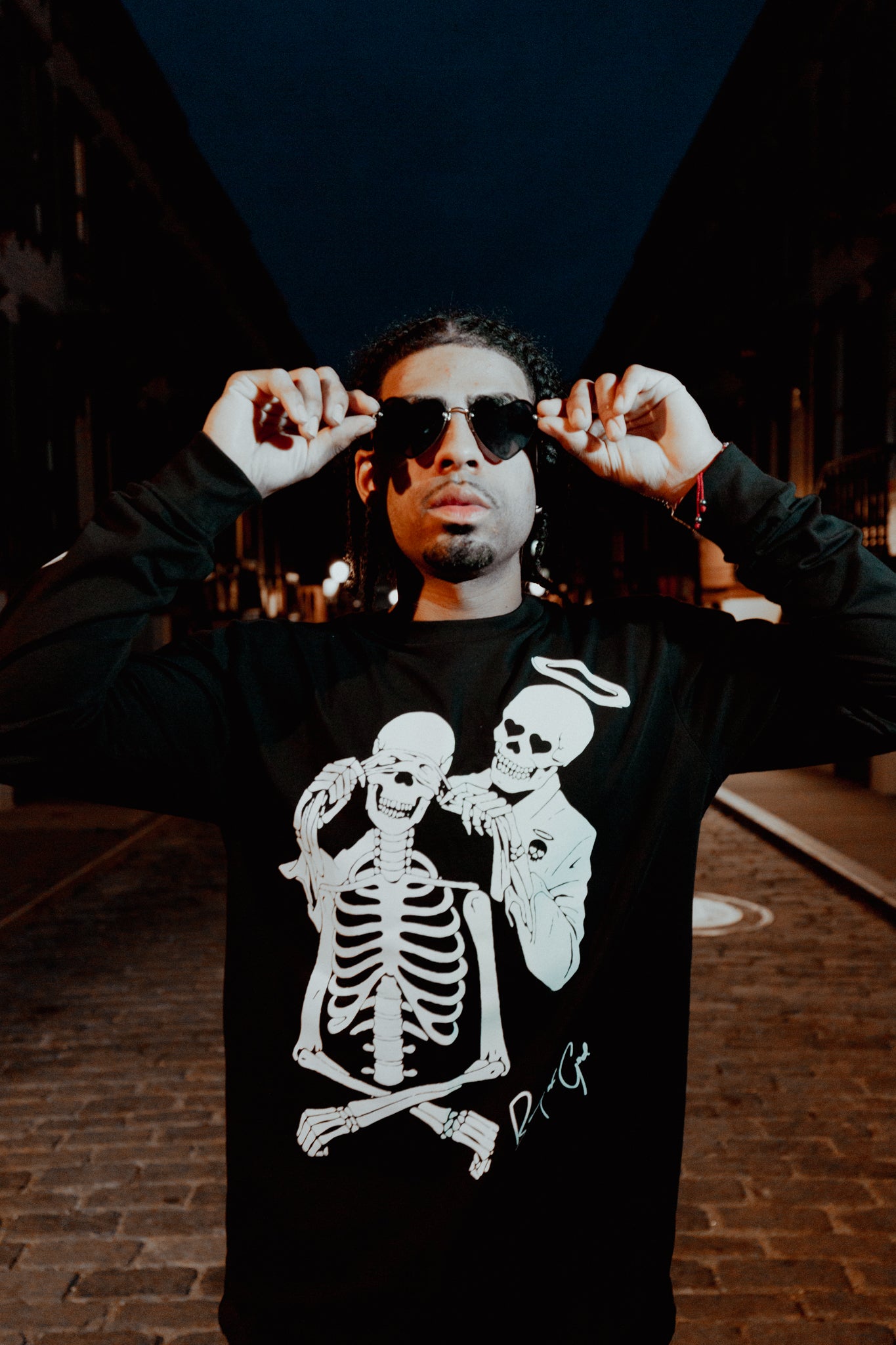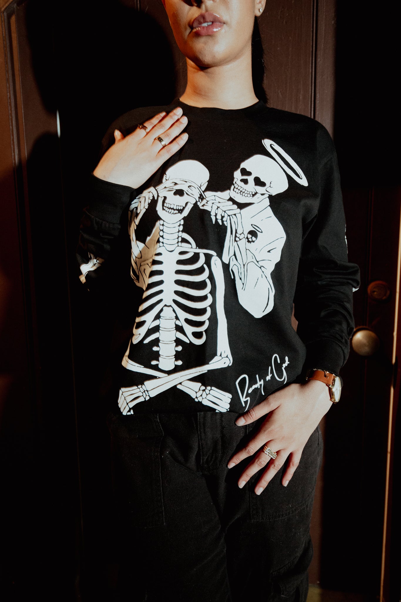 The front graphic showcases a striking skeleton illustration—a mix of dark humor and divine energy, with one skeleton playfully covering the eyes of another while a halo floats overhead. Bone graphics run down both sleeves for a fully wrapped, full-impact look. Finished with the signature branding hit at the bottom.
