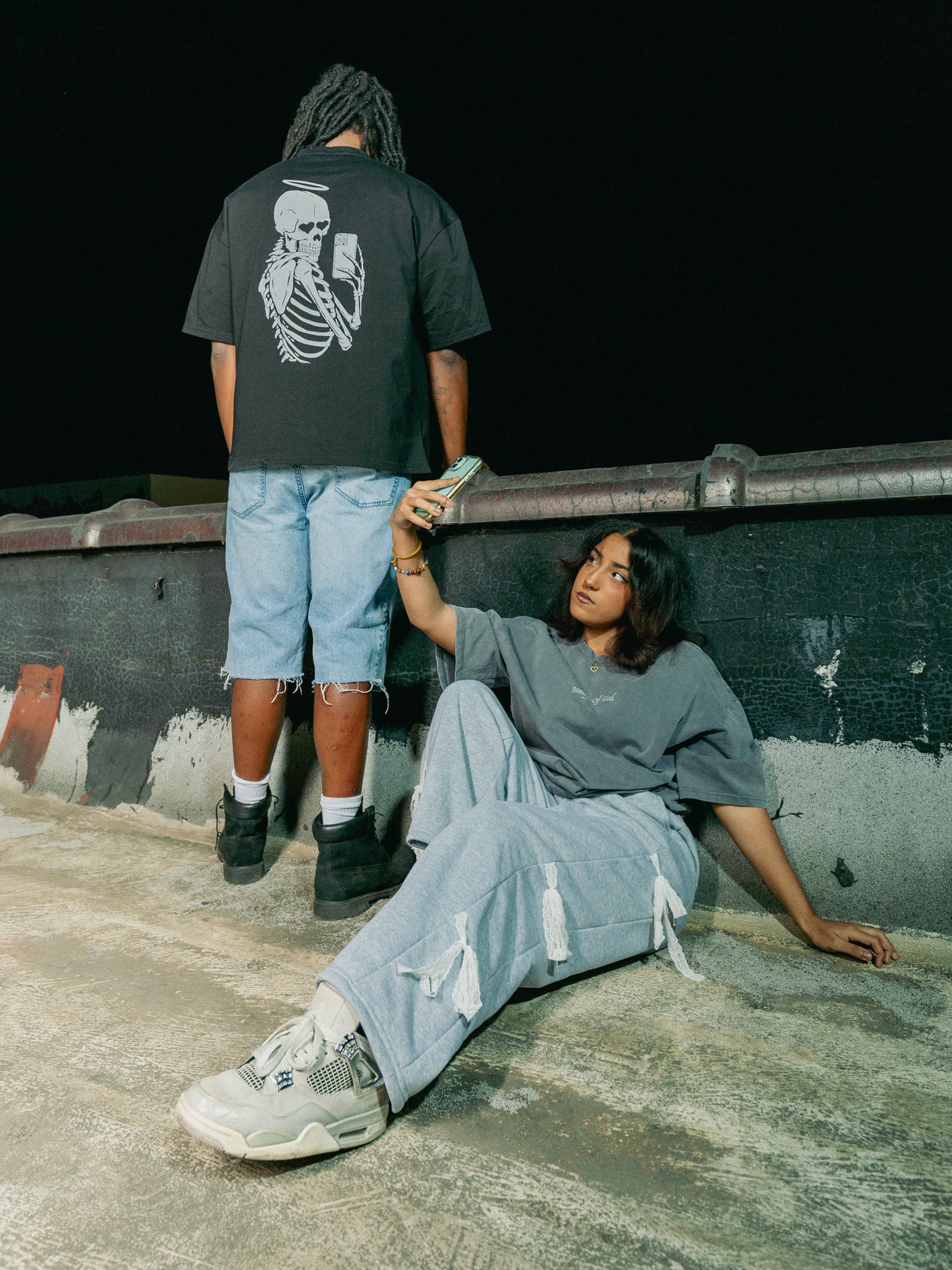 The Reflective Skeleton Tee brings a bold, eye-catching back graphic that goes crazy under flash. The reflective skeleton selfie with the halo hit turns every pic into a moment. Made with thick, premium cotton and cut in an oversized fit, this tee gives you that modern, relaxed silhouette built for real wear.